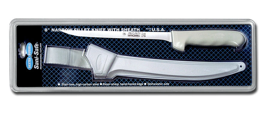 Fillet knives are designed to be thin and flexible giving you great control and precision. Often used with fish, these knives are capable of lying between the skin and top layer of meat to provide a nice clean cut. Their blades have engineered flex points that spring back to its shape. They will glide right through the meat and hold a very sharp edge, hardly needing to be re-sharpened. When the knives need to be re-sharpened they will sharpen to the same sharpness as they were before thanks to the DEXSTEEL they were created with. Fillet and boning knives have similar uses except that a fillet knife is much longer and thinner allowing for easier work when dealing with fine and thin cuts.Â