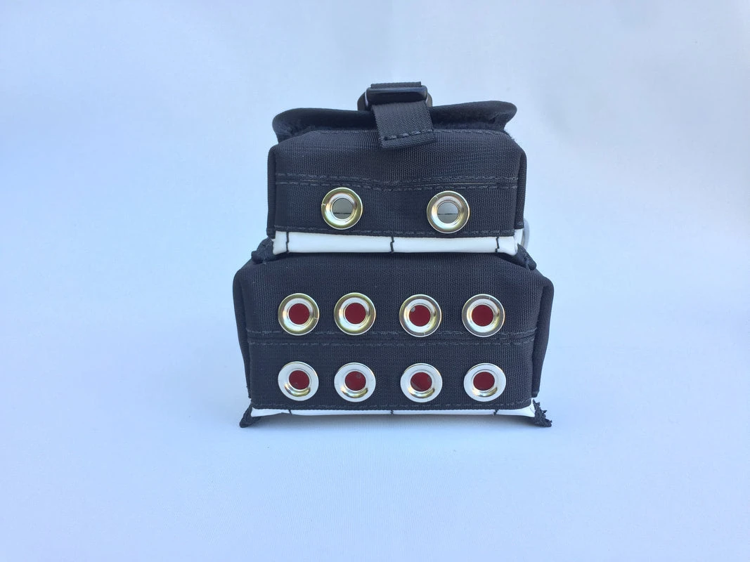Gear-Up’s two tube with front pouch was made for surf casters who love to carry ‘all-in-one’ surf bag. It comes with a removable shoulder strap. Two plastic clips; one for the main flap of the bag and the other for the pouch. These clips will ensure surf casters who are wet suiting out to rocks once locked in, no plugs or tins will fall out of the surf bag. The front pouch has no bucktail or tins slots, it is completely empty inside. The front pouch can be used for bucktails, tins or soft plastics all depending on what the surf caster wants to throw in that given day. It has two brass nickle plated d-rings on each side of the bag where the removable strap is attached too. The back of the surf bag has two heavy-duty scuba webbing material belt loops. The bottom of the bag has plenty of grommets for fast drainage.