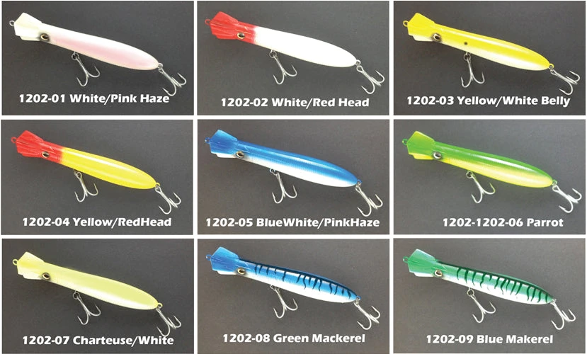 The Flying Squid is an improved pencil popper with features not seen before on production surface lures. The fins at the head end allow for greater distance when casting into a head wind because of their stabilizing influence which virtually eliminates wobble and therefore cuts way down on wind resistance. The fins also cause substantially more turbulence when the lure is worked, due to the increased square inches of lure body slapping the surface water as it is “popped”, and pencil poppers are all about commotion on the surface. You will quickly notice how much easier it is to work this lure, and how much value the fins add to the total package.