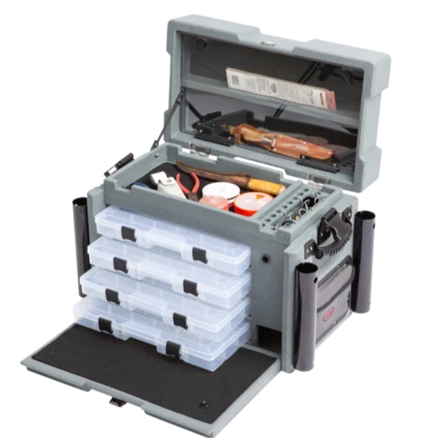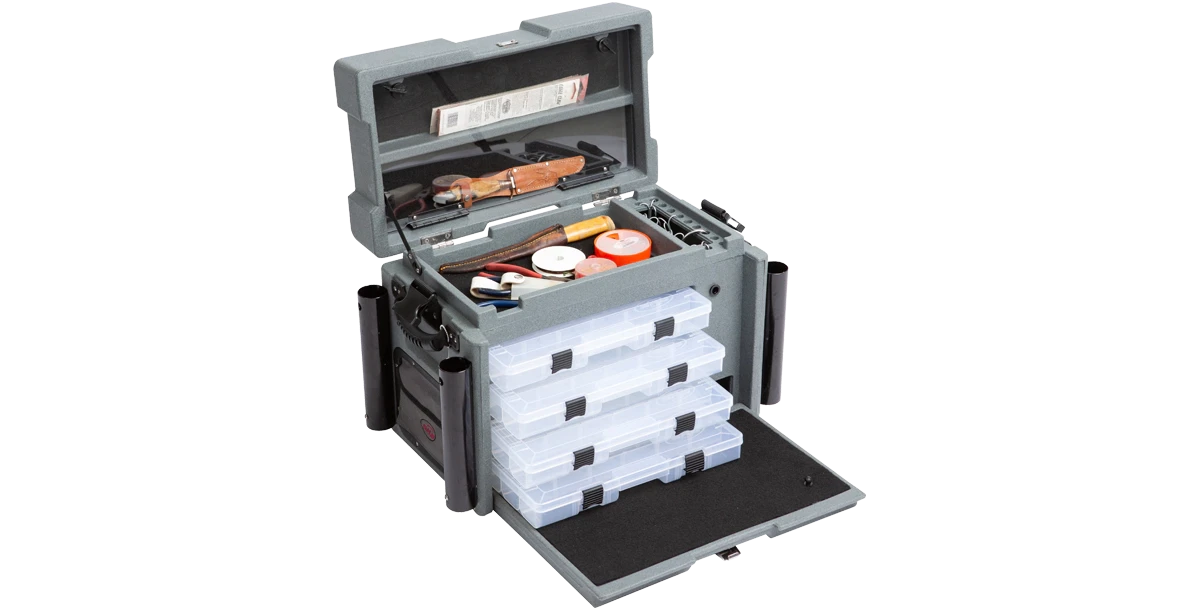 The SKB Tackle Box 7200 features indestructible rotationally molded construction with stainless steel hardware and fasteners. The lid opens 90-degrees or 180-degrees for convenient access to lid storage through a clear acrylic door, and four storage boxes with dividers keeps everything organized.