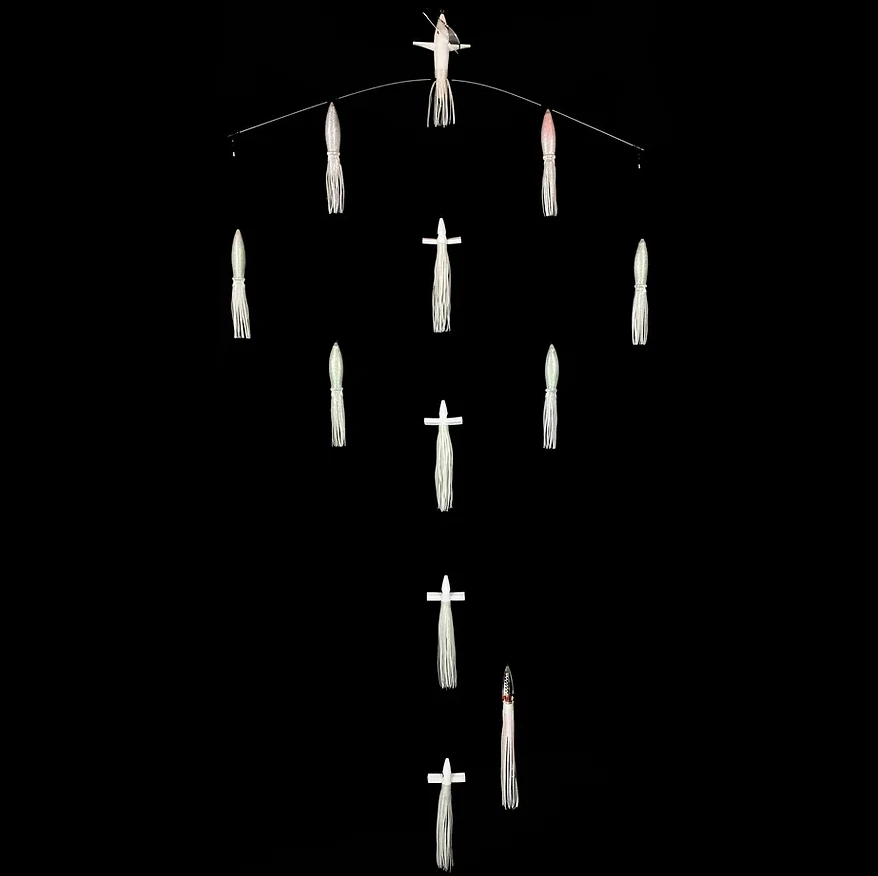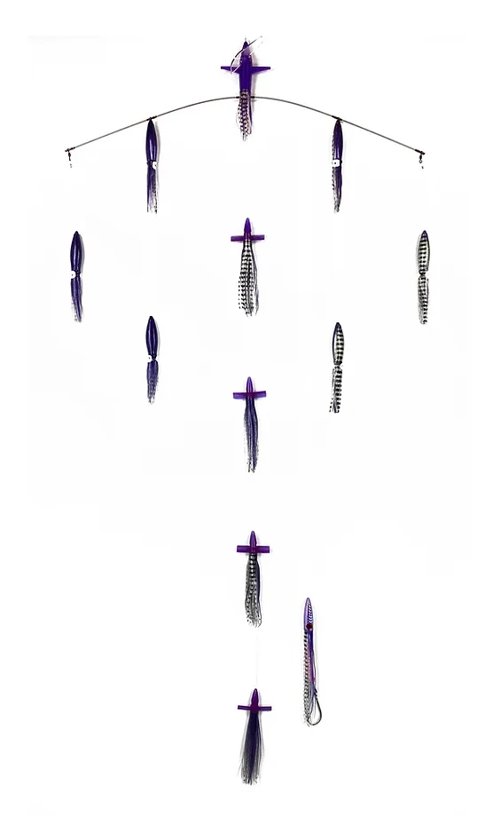 400# Stainless Bearing Swivel inside last teaser. For easy change out of stinger, ie: contrasting color lure, ballyhoo, or cedar plug.