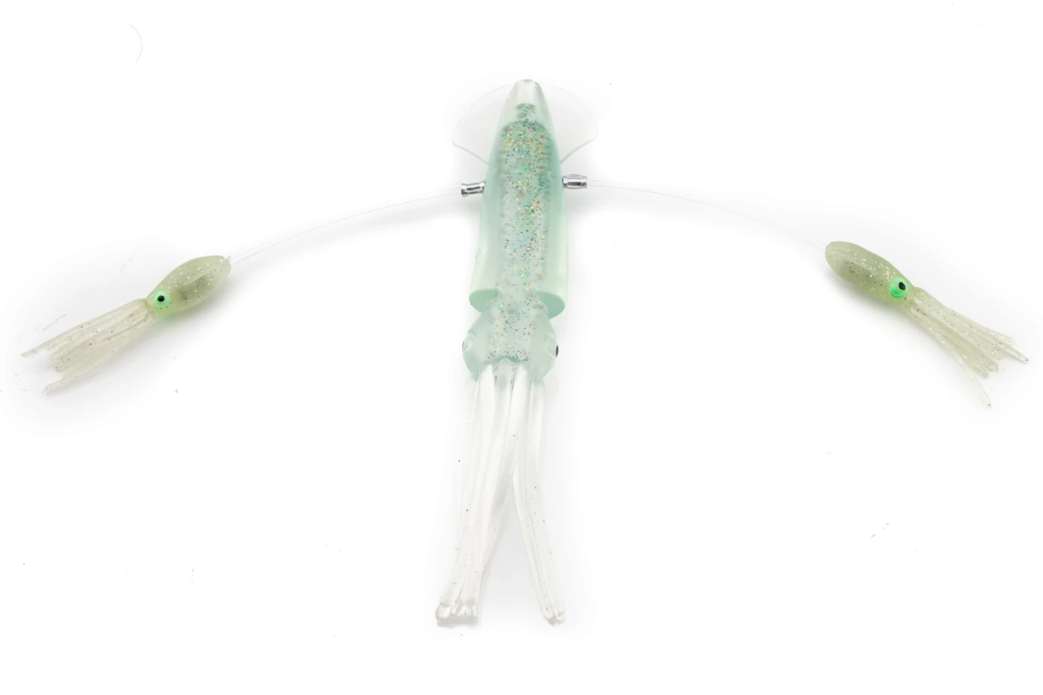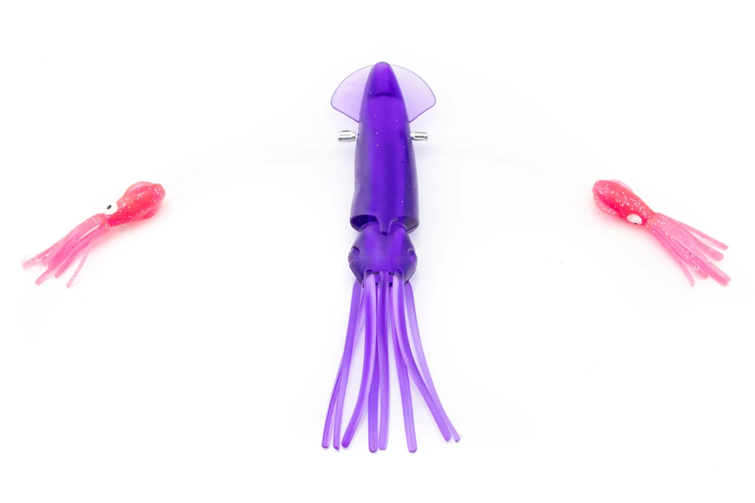 Our custom rigging is the best in the business. This daisy chain teaser is built using junior floppy squids. This is an excellent chain for Northeast tuna fishing. The ball bearing snap swivel at the end allows you to attach any lure of your choice. For tuna, we recommend adding a hook bait with a 5 foot leader. For billfish, a hookless teaser with a 2-3 foot leader is perfect.