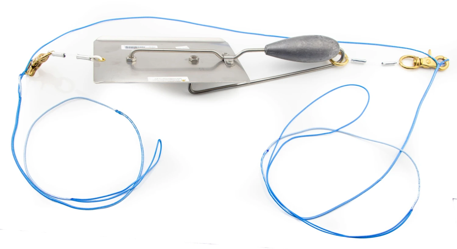 This planer bridle system allows you to run your planer in line on your big game setups to get your bait down deeper when trolling. There is no need to have a separate planer rod anymore with a breakaway with a setup like this. This bridle is rigged on 500 lb. hollow core braid, and it is able to pass through wind-on style roller guides. This bridle has loops at each end to attach it between your backing and mono topshot. In the middle of the bridle, there are two loops that allow you to attach the planer using clips.