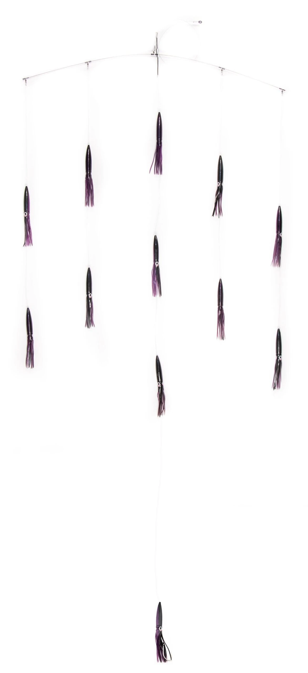 These spreader bars are rigged in a pattern that is meant to give the illusion of a group of squids/baitfish moving as a school with an “injured” bait dropped further back as the hook bait. This particular bar works well in any position in the spread, but our favorite spot for it is on the short rigger.