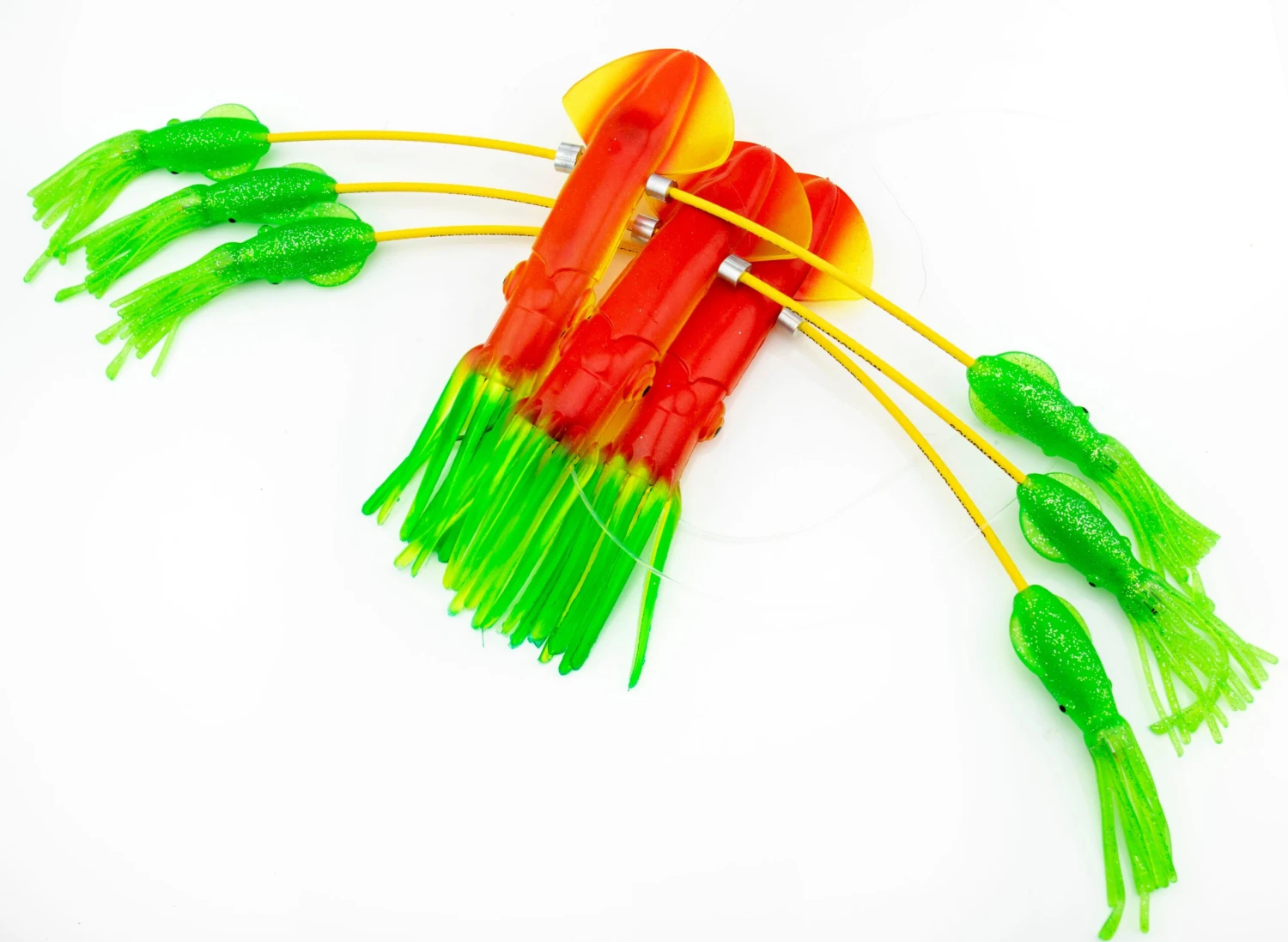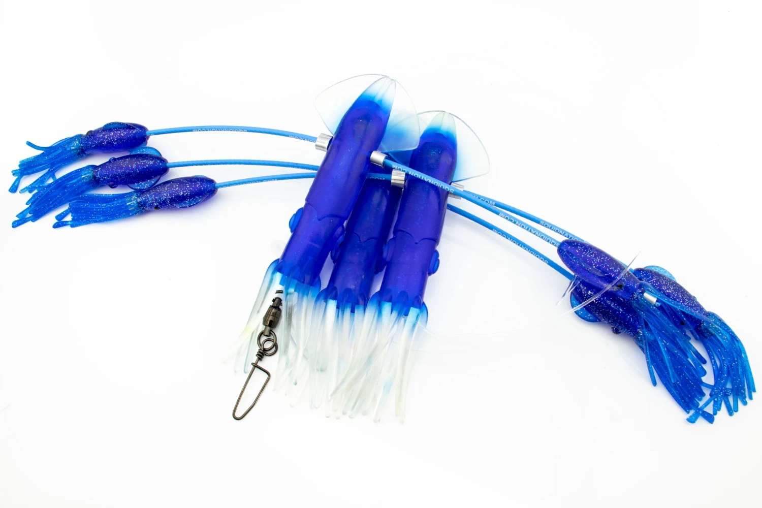 Our custom rigging is the best in the business. This daisy chain teaser is built using Squidnation “Flippy Floppy Thing” squids. These rigs have been proven as a sailfish and marlin raising machine, and we went ahead and modified it a little bit to optimize it for Northeast tuna fishing, while still being a great billfish teaser. The ball bearing snap swivel at the end allows you to attach any lure of your choice. For tuna, we recommend adding a hook bait with a 6 foot leader. For billfish, a hookless teaser with a 2-3 foot leader is perfect.